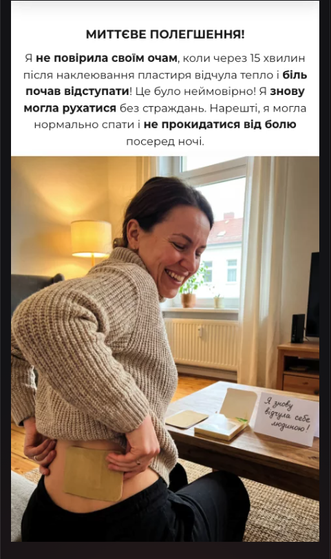 Використовую при болю в попереку. Дуже зручно — наклеїла і займаюся своїми справами. Біль стає значно меншим вже через 20–30 хвилин. Сподобалось, що склад натуральний.